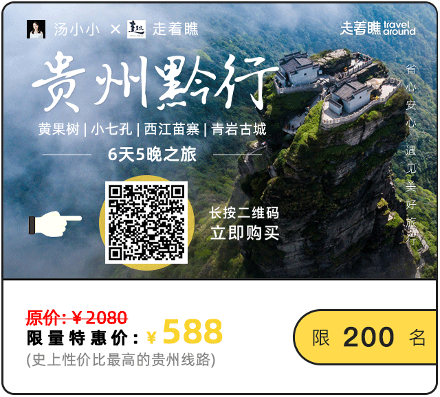 一趟6天5晚超高性价比的贵州黔行专线原价2080元 限量仅200份优惠现588元即可体验一趟高品质贵州游抢空后立刻恢复原价 早买早便宜 先人一步,扫码抢购▼