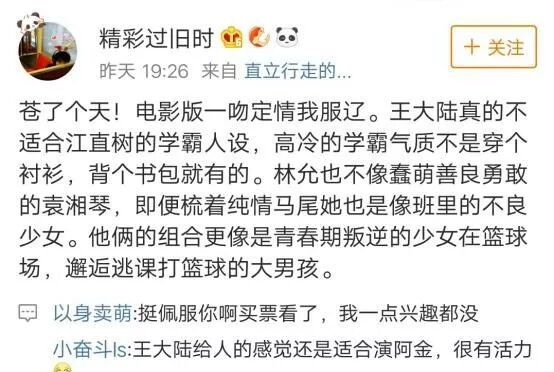 同时网友指出,学霸并不是穿个衬衫背上书包,就有了这种气质,所以王大陆还是非常适合阿金的人设,饰演阿金完全是本色出演,至于学霸还是差一点。而林允即使是梳着可爱的马尾辫,但是怎么看也像是个不良少女。两人CP组合更像是青春期的叛逆少女在篮球场邂逅逃课打篮球的大男孩。
