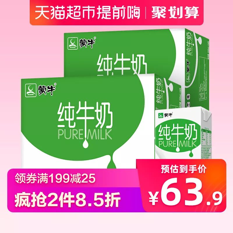 蒙牛纯牛奶PURE MILK 250ml*16包*2提 拍2件4箱用169-20券,到手126.2元淘口令:$tf5EYIW8a6R$