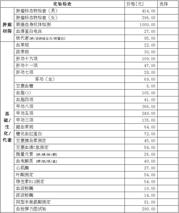 标准套检-甲功五项-胃泌素G17检测 眼科 眼压 眼底照相 脑彩超 颈动脉彩超 头部CT(诊断用途) 心脏彩超 人体成分电诊断 电子直肠镜 甲功八项 胃功能检测 微量元素 同型半胱氨酸 叶酸测定 风湿三项 血沉 心肌酶 凝血常规 铁代谢 血栓弹力图试验