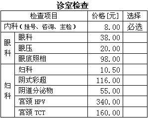 标准套检 眼科 眼压 眼底照相 头部CT(诊断用途) 颈动脉彩超 脑彩超 心脏彩超 人体成分电诊断 空腹胰岛素测定 血清C肽测定 同型半胱氨酸 心肌酶 超敏C反应蛋白 维生素B12测定 血栓弹力图试验
