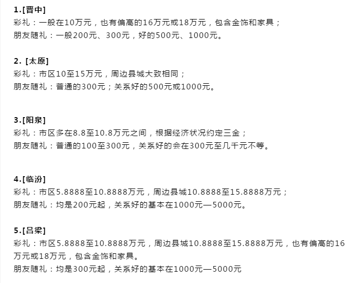 山西省11个地级市彩礼钱排名: