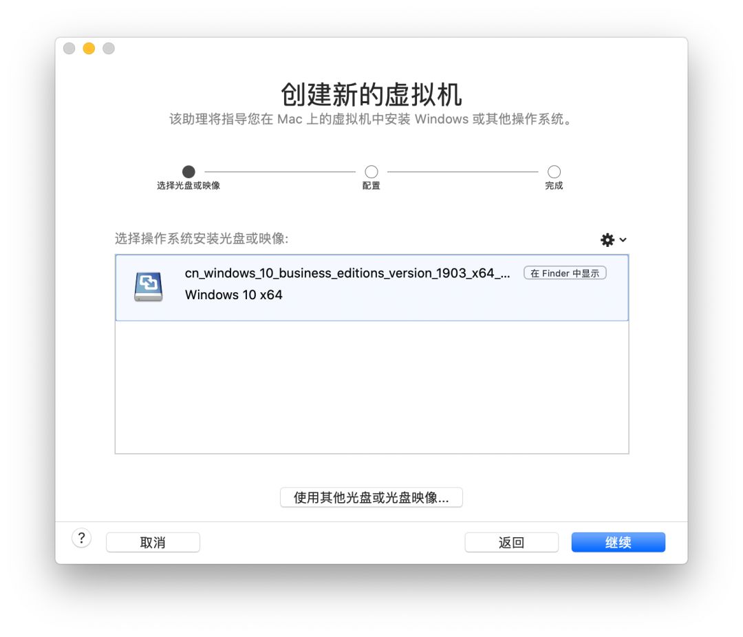 安装完成后会弹出上面窗口,直接点击【继续】进入下图选择安装镜像文件窗口,在该窗口中把你下载好的Windows 10镜像文件拖动送【选择操作系统安装光盘或映像】中,也可以通过点击【使用其他光盘或光盘映像..】添加系统镜像,添加后直接点击【继续】按钮。