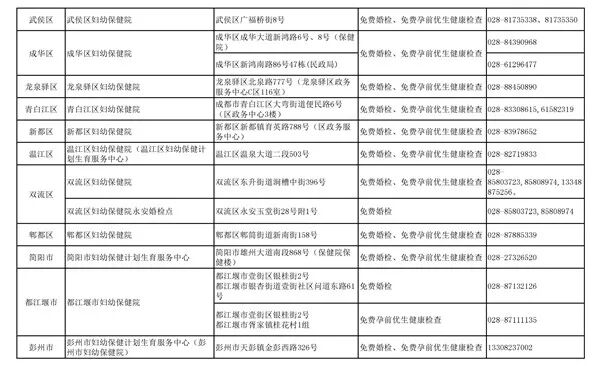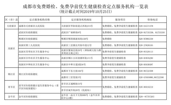 25日,成都市卫健委官微公布成都市14项婚前健康检查、19项孕前优生健康检查全免费定点机构和检查项目