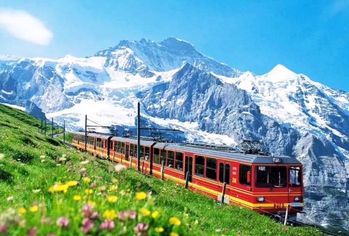 阳光照射下的阿尔卑斯山,一块一块的覆盖着积雪,白色与绿色相间,形成一幅交融的完美画卷,仿佛不曾有过任何故事。