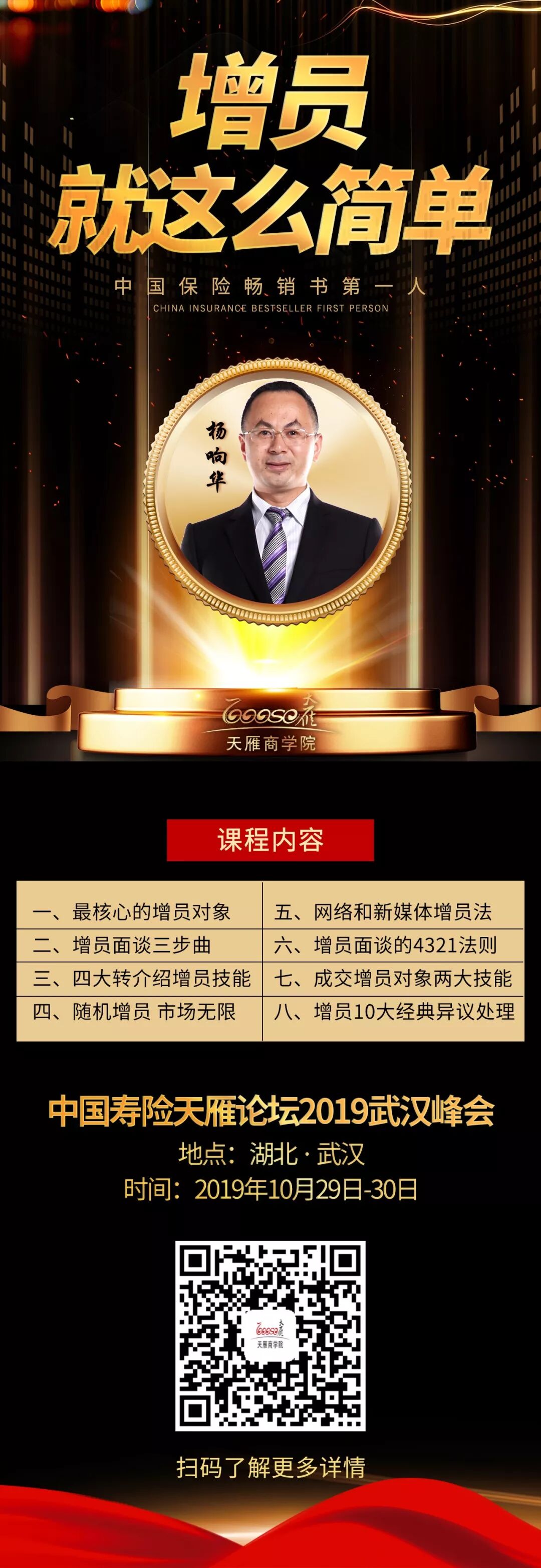 2019年10月29日——10月30日,实战派保险家杨响华老师受天雁商学院邀请为天雁论坛特聘讲师,将会在天雁论坛武汉峰会为大家带来《增员就是这么简单》的课程分享,想要到场学习的同学,可长按识别图中二维码了解详情。