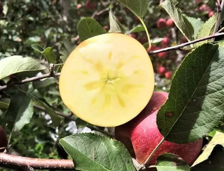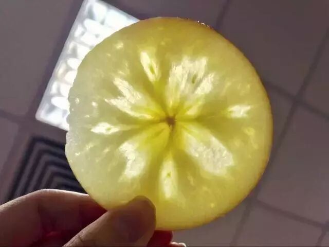 冰糖心脸皮厚,果肉色泽淡黄,果核四周有透明糖心,糖心自然天成果点大小不一,特有卵圆形,果面色泽自然,独特浓郁果香,沁人心脾,