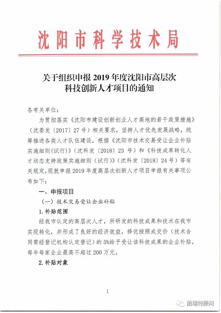 关于组织申报2019年度沈阳市高层次科技创新人才项目的通知