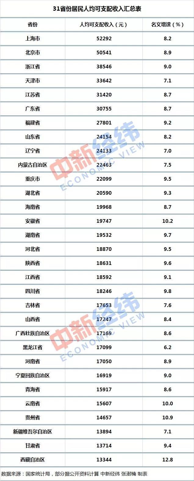 04国家统计局公布31省份前三季度居民人均可支配收入,京沪突破5万元