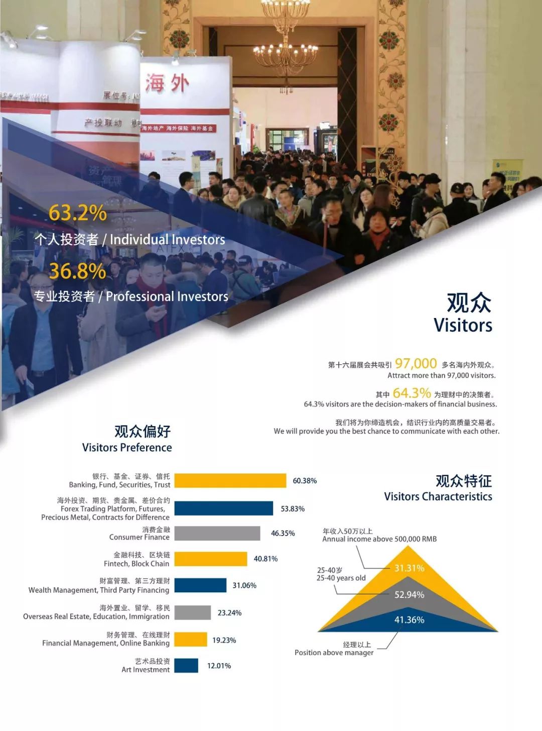 汇聚国内外金融领域内领先的银行、保险、基金、证券、期货、信托、海外投资、金融科技、财富管理、海外置业、其他相关行业机构与企业。