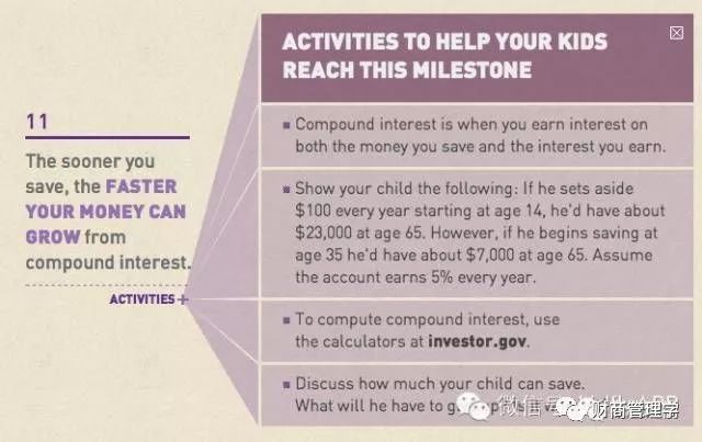 2)向孩子展示下面的例子:假设每年的存款利率是5%,如果你从14岁开始每年存下$100,到65岁时大概就有$23000。但如果你从35岁才开始存,到65岁时就只有$7000;