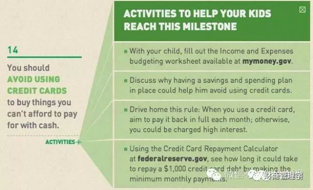 3)在家实行这个制度:使用信用卡时,要下决心还清当月卡数,不能还清的,家长可以收取更高的利息;