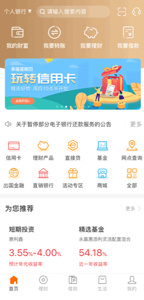 “个人银行”与“企业银行”双模式自由切换,所有服务开放浏览,无卡客户也可以使用他行卡支付;用户界面个性定制,产品服务精准推送。