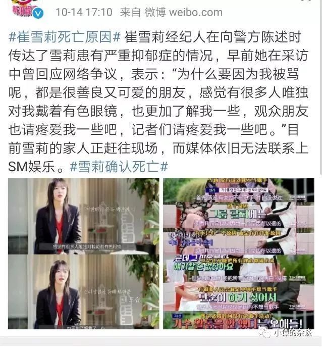 而对于崔雪莉自杀的主要原因,官博给出的声明则是受到了网络暴力以及患上了抑郁症导致,也希望崔雪莉在天堂能无忧无虑的生活,面对大家的舆论导向,在崔雪莉死亡之后,经纪人也证实了崔雪莉所作出原因,希望大家不要带着有色眼镜来看待大家,也希望大家对明星能给予更多的空间和尊重。