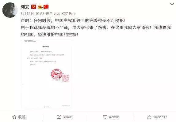 刘雯在第一时间和品牌方解了约。