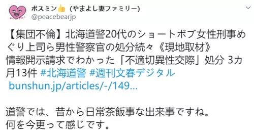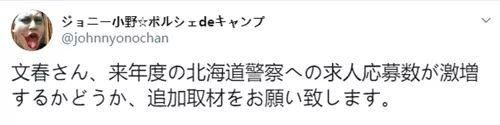 更有网友开玩笑表示,“文春,如果明年北海道警察招聘人数暴增的话也拜托你们进行追加采访了。”↓