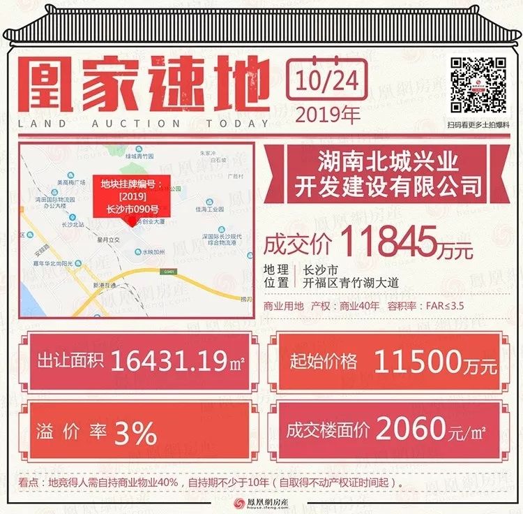 据凤凰网房产统计,上周(2019.10.20-2019.10.26)长沙市开福区青竹湖板块有一宗商业用地成交。经过4轮竞价,[2019]长沙市090号地被湖南北城兴业开发建设有限公司以11845万元竞得,成交楼面价2060元/平,溢价率3%。
