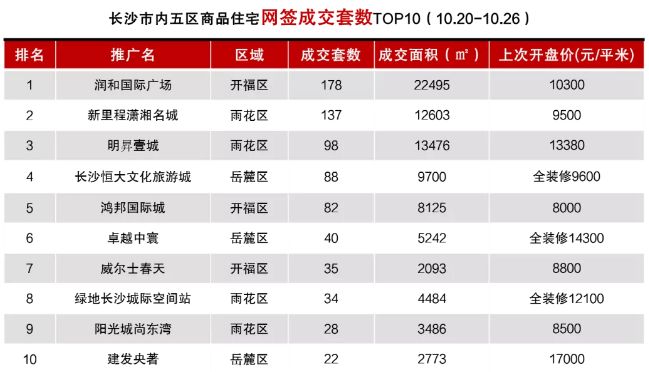 据湖南中原数据平台显示,上周(2019.10.20-2019.10.26)长沙一手住宅成交1263套,成交面积15.19万方,环比分别下跌18%、25%;内五区新增商品住宅3808套,49.86万方,环比分别上涨217%、301%。润和国际广场位居网签成交套数排行榜(10.20-10.26)首位,成交178套。