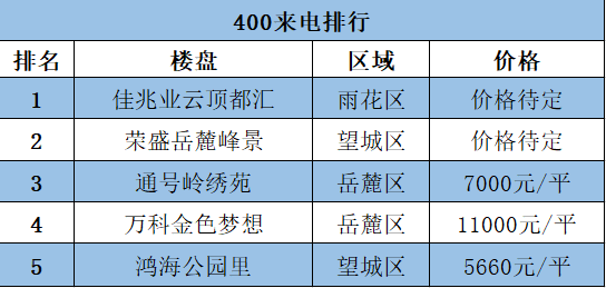 据凤凰网房产统计,上周(2019.10.20-2019.10.26)长沙400来电量最多的5个楼盘分别为佳兆业云顶都汇、荣盛岳麓峰景、通号岭绣苑、万科金色梦想和鸿海公园里。