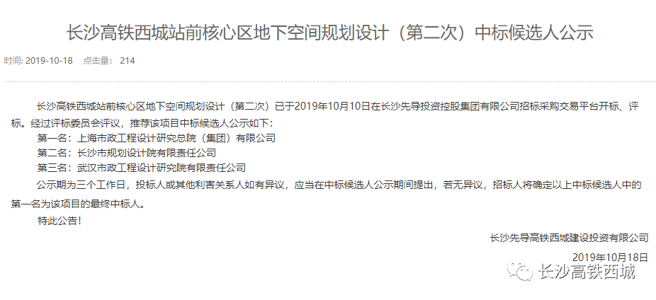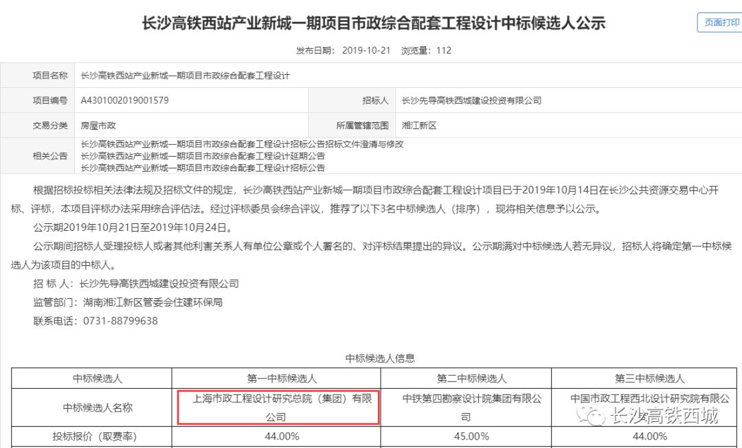 并且,《长沙高铁西站产业新城一期项目市政综合配套工程设计》也由上海市政工程设计研究总院(集团)有限公司成功中标。