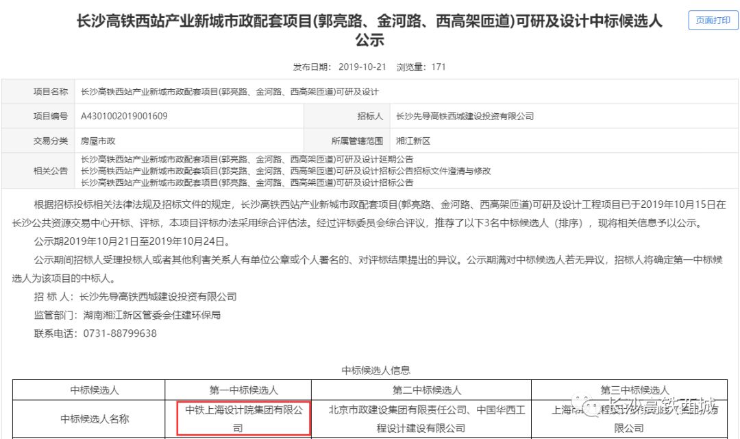 另外,《长沙高铁西站产业新城市政配套项目(郭亮路、金河路、西高架匝道)可研及设计》由中铁上海设计院集团有限公司中标。