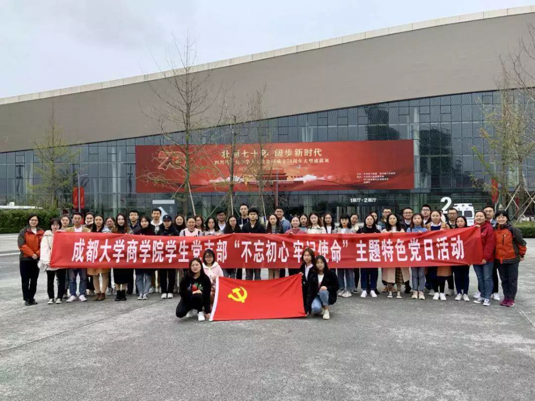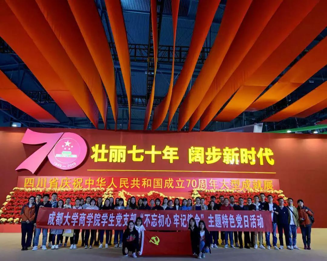 为深入推进“不忘初心、牢记使命”主题教育,2019年10月25日下午13点40分,成都大学商学院学生党支部“不忘初心、牢记使命”主题特色党日活动在成都西博城顺利开展,活动内容是参观“壮丽七十年阔步新时代——四川省庆祝中华人民共和国成立70周年大型成就展”。本次活动由党委副书记涂静和学工办衡容老师带队,商学院学生党支部全体党员参加。
