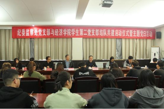 为切实加强基层党建工作,促进优势互补、资源共享、思想共进,10月15日,纪委监察处党支部与经济学院党总支学生第二党支部在实字2号楼105会议室开展结对共建启动仪式暨主题党日活动。机关党总支书记李庆亮、校纪委副书记侯存敏、校纪委监督监察科科长王卉、经济学院党总支副书记刘永君、副书记于明华,以及学生第二党支部全体学生党员参加了启动仪式。会议由经济学院学生第二党支部赵文崛主持。 仪式上,侯存敏就开展支部共建活动的背景做了介绍,并就进一步开展支部共建提出了意见和建议。他指出,共建双方应该本着实事求是、与时俱进、开拓创新的原则,互相帮扶找创新点,结合实际找难点,密切学生找结合点,真正把共建工作做实、做新、做细,做出成效,努力为新形势下我校基层党建工作的改革发展提供动力和保证。赵文崛详细介绍了本支部的情况。他表示,学生党支部非常感谢学校党政部门对学生工作的大力支持,一定会不辜负学校领导的关心和殷切期望,努力把支部共建工作做好!李庆亮对结对共建表示支持,对两个支部未来协作共建寄托了深切的期望。他要求,共建双方要提高政治站位,树牢“四个意识”,践行“两个维护”,主动担当作为,努力创新开展基层党建工作,为学校的高质量发展贡献力量。