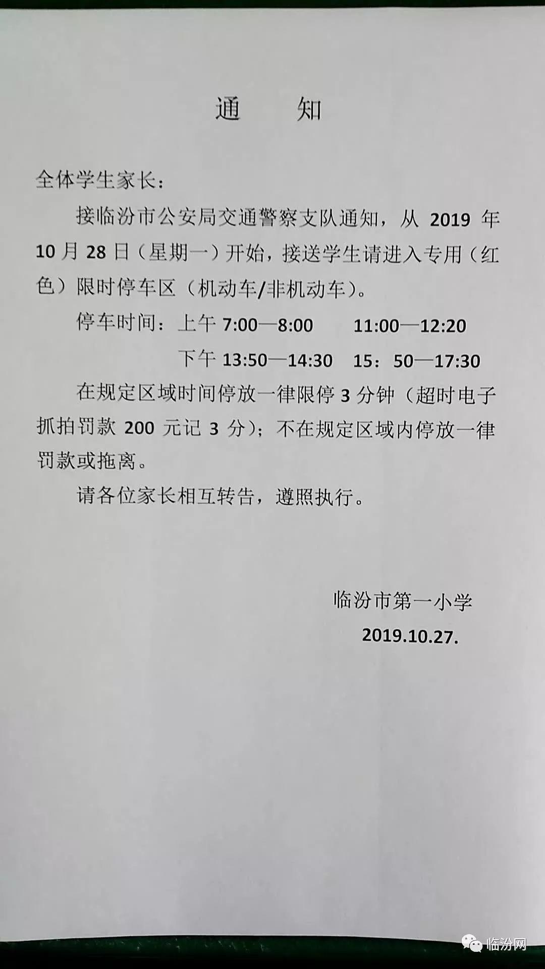 以下是临汾市第一小学的通知: