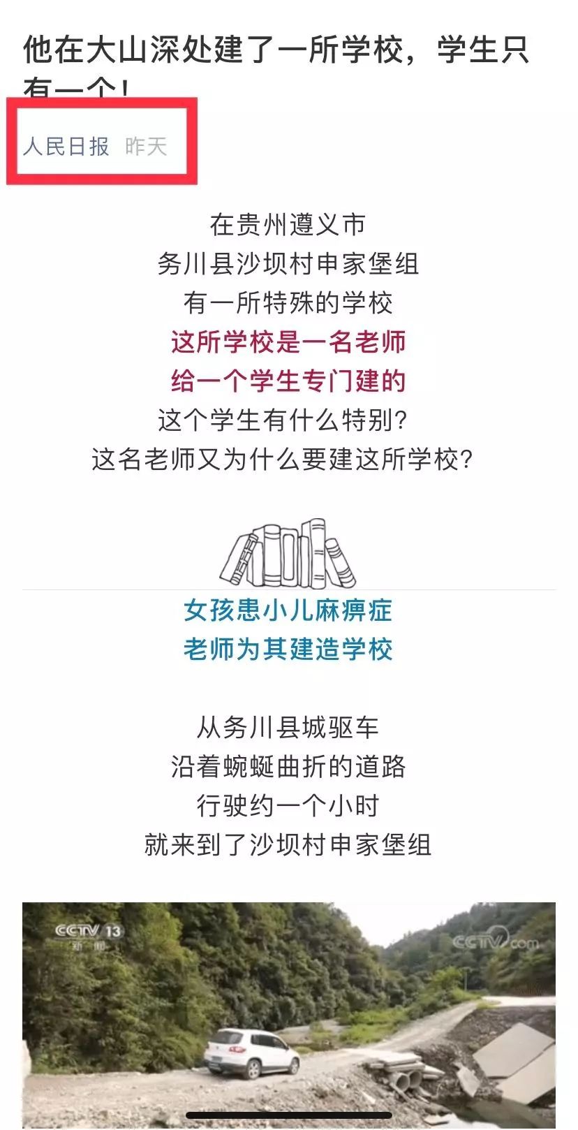 近日,人民日报公众号、央视新闻公众号分别刊发了标题为《他在大山深处建了一所学校,学生只有一个!》一文。