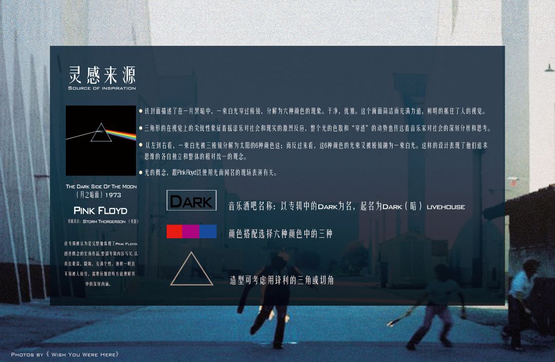 我的灵感来源于平克·弗洛伊德(Pink Floyd)的经典专辑 月之暗面(The Dark Side of The Moon),整体的设计风格也是以该专辑来进行。