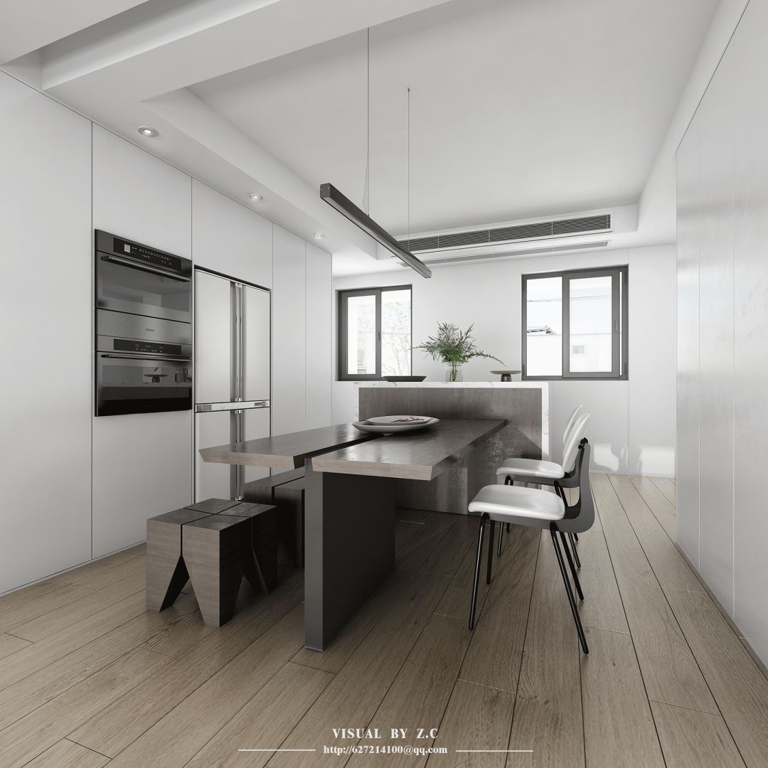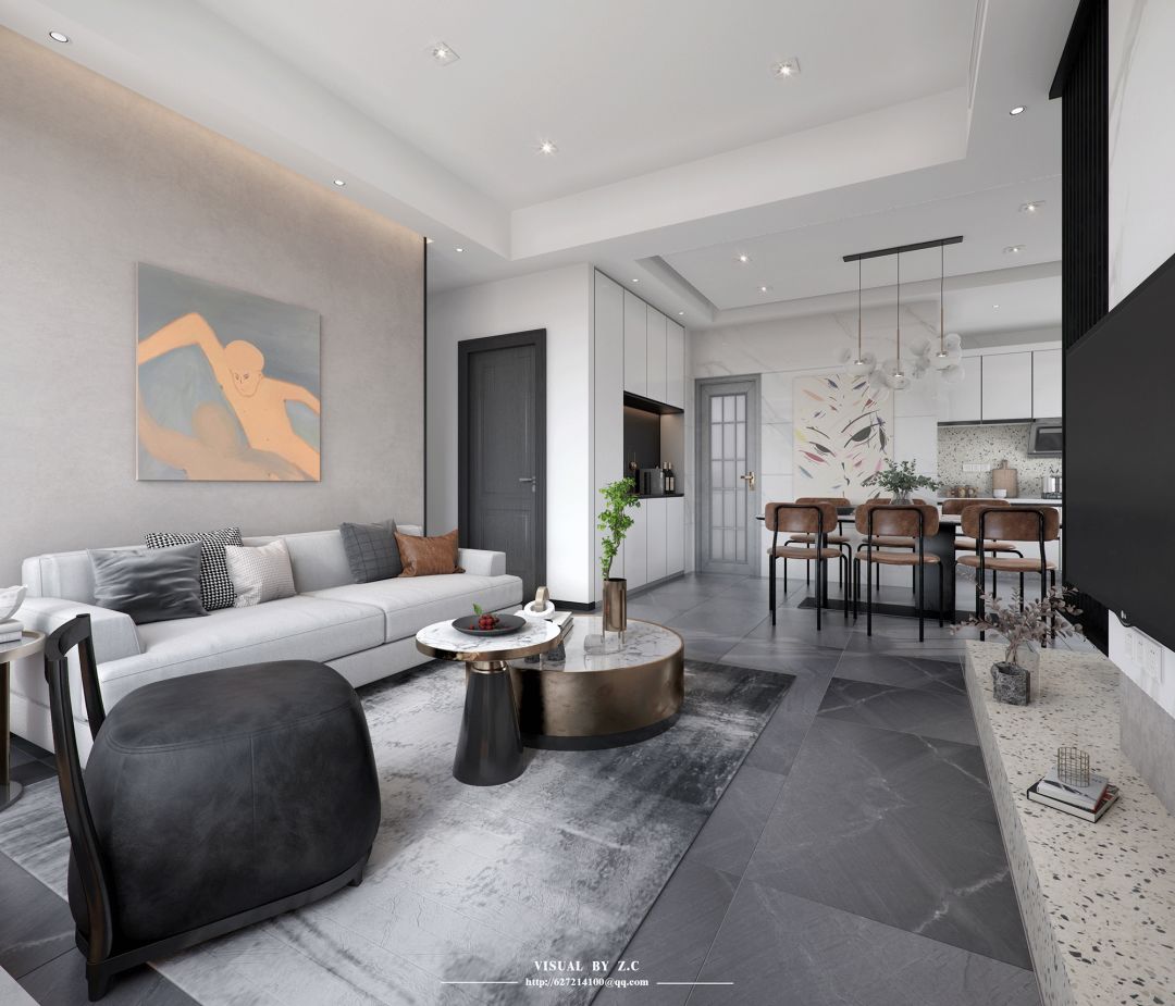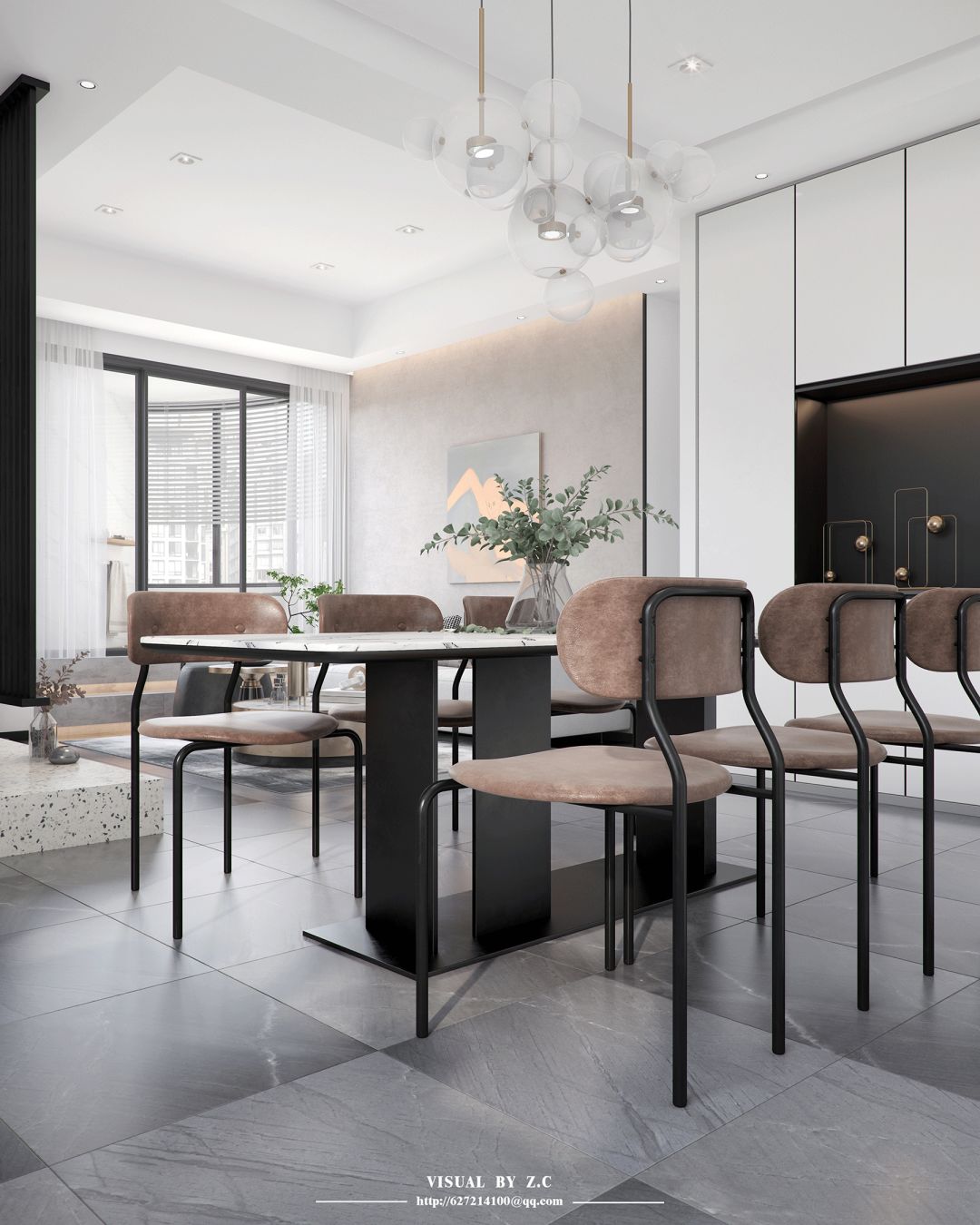 这是近期的一套渲染作品,客餐厅空间不大,开放式厨房,整体空间颜色介于冷淡和热烈之间的色彩,在空间的颜色散布中加入了一定比例的灰度,空间简约而不简单。我比较讲究细节,在材质处理上也花了一些心思,如金属的反射和皮革的质感。
