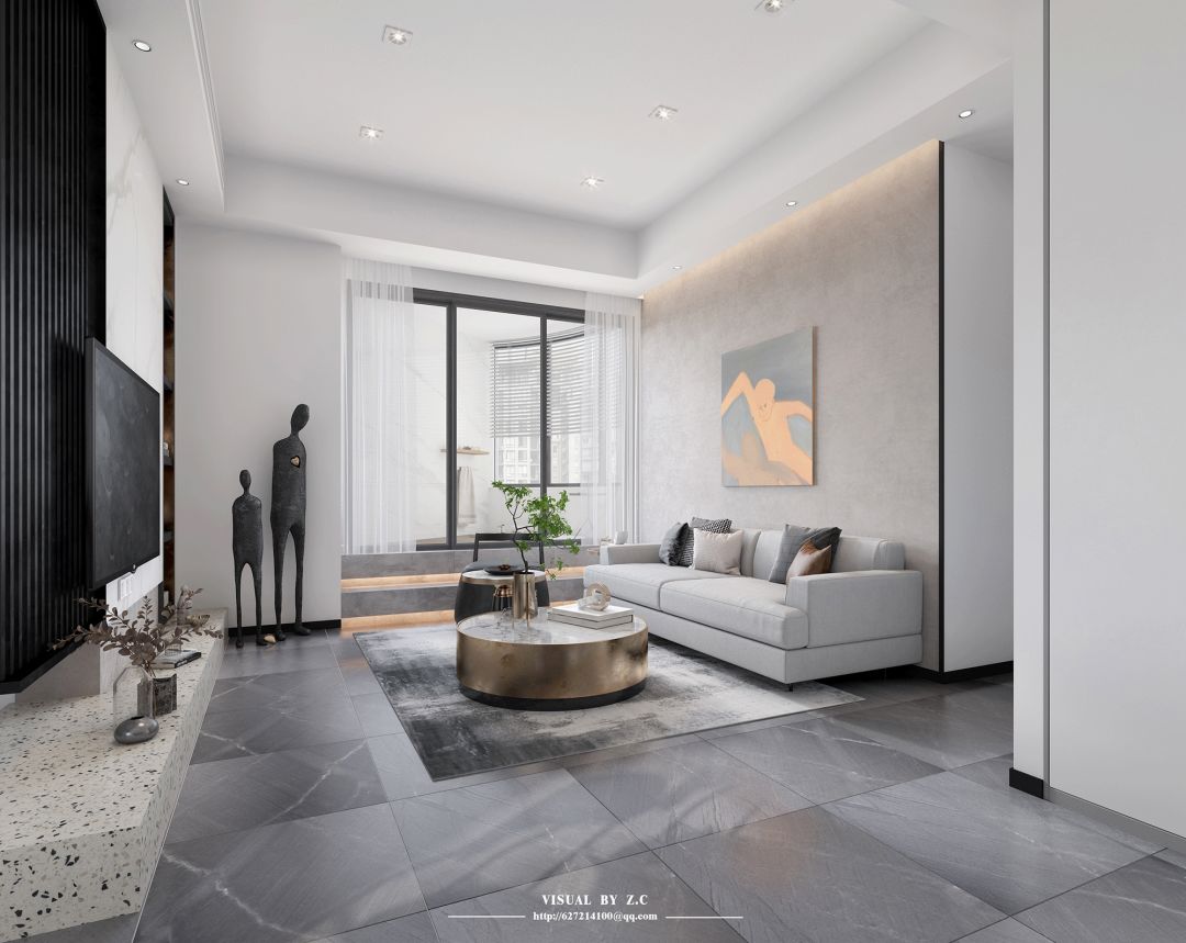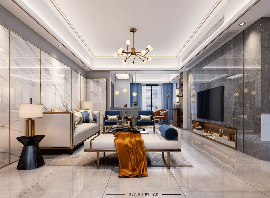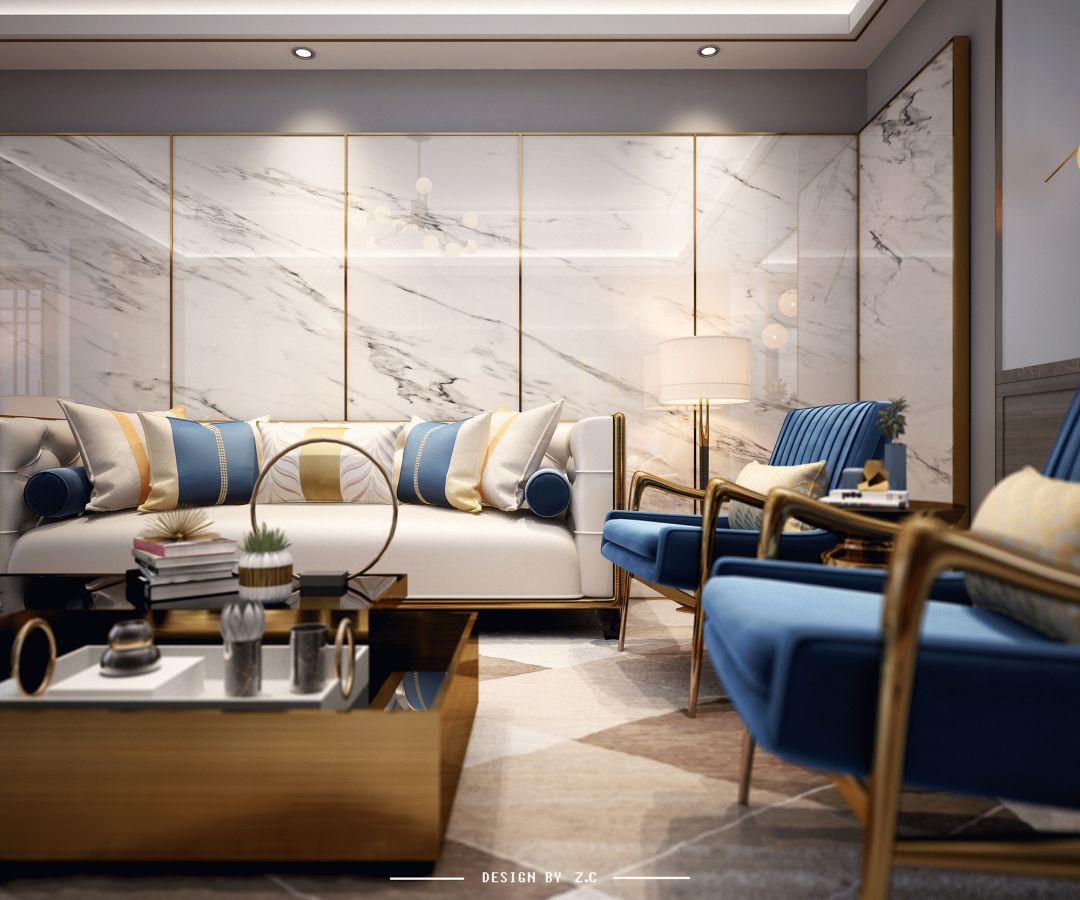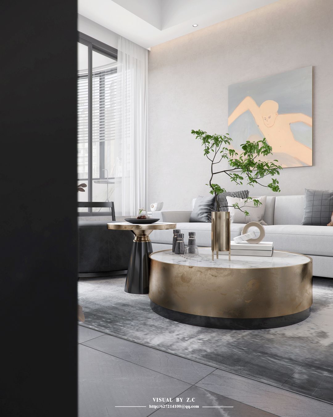 这是一套现代轻奢风格的表现作品,整体以暖色为基调,家具和金属线条互相呼应,加上软装的点缀结合,碰撞出空间的高级质感。