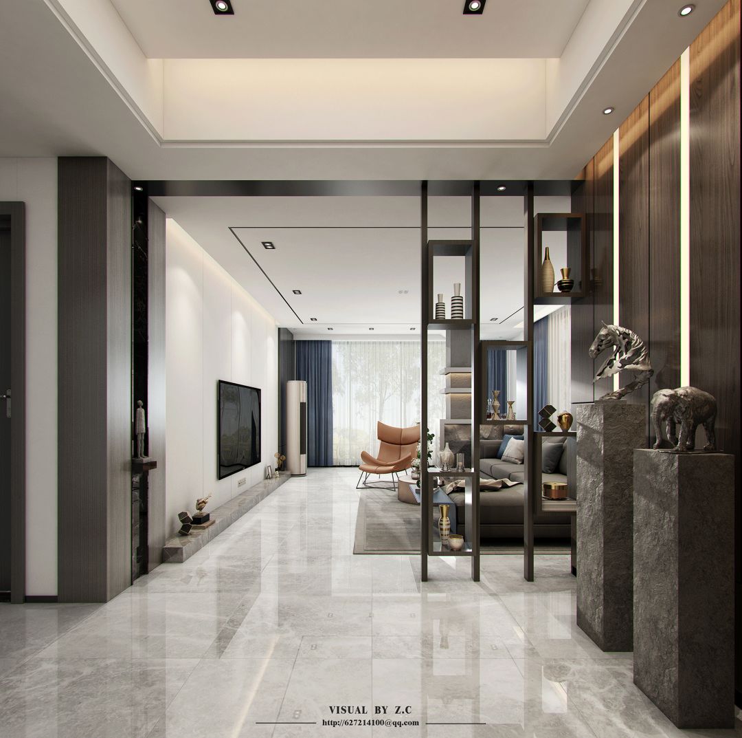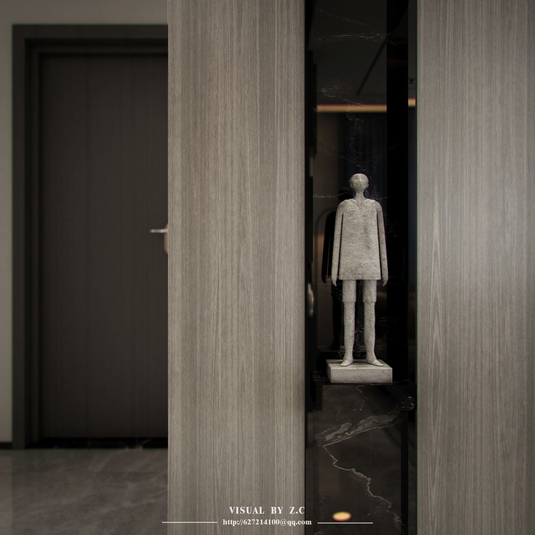 这是一套现代的设计表现作品,由于空间采光良好,所以玄关设计上也较为简单,最大限度地纳入室外的自然之景,与客厅区一并形成了采光观景的空间效果。